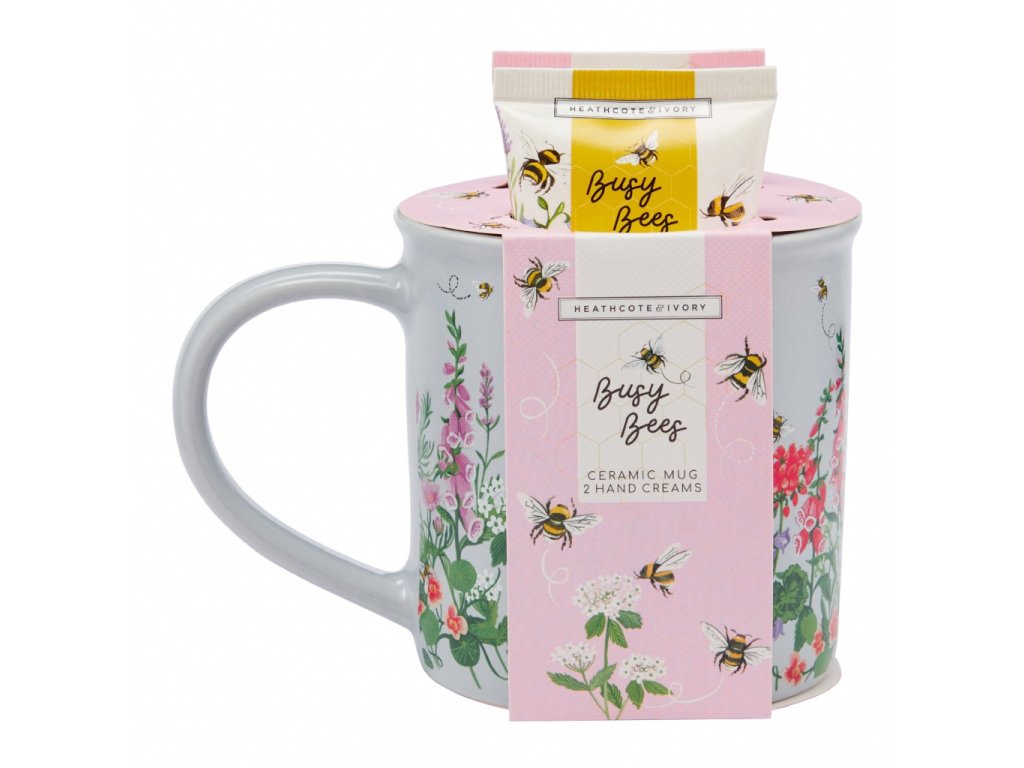 Sada přírodních krémů na ruce ve dvou vůních, Med & Růže, Med & Pomerančový květ. A k tomu krásný keramický hrnek s motivem čmeláků a květin.