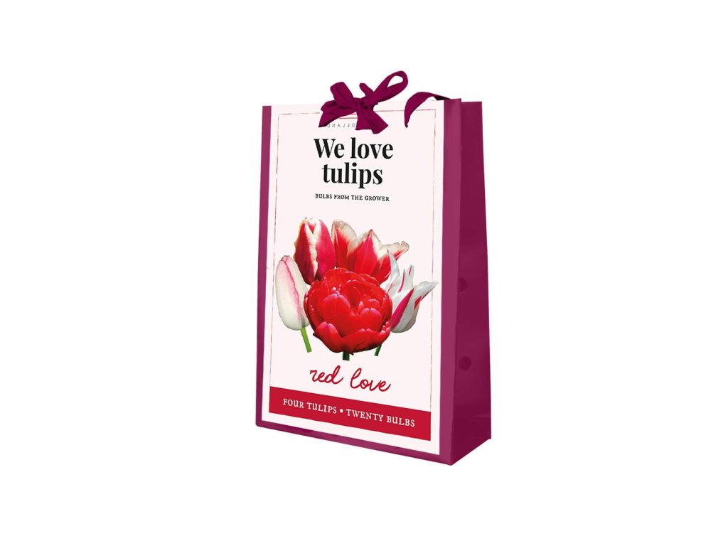 1 dekorativní sáček We Love tulipány, Red Love. Směs různých červených tulipánů.